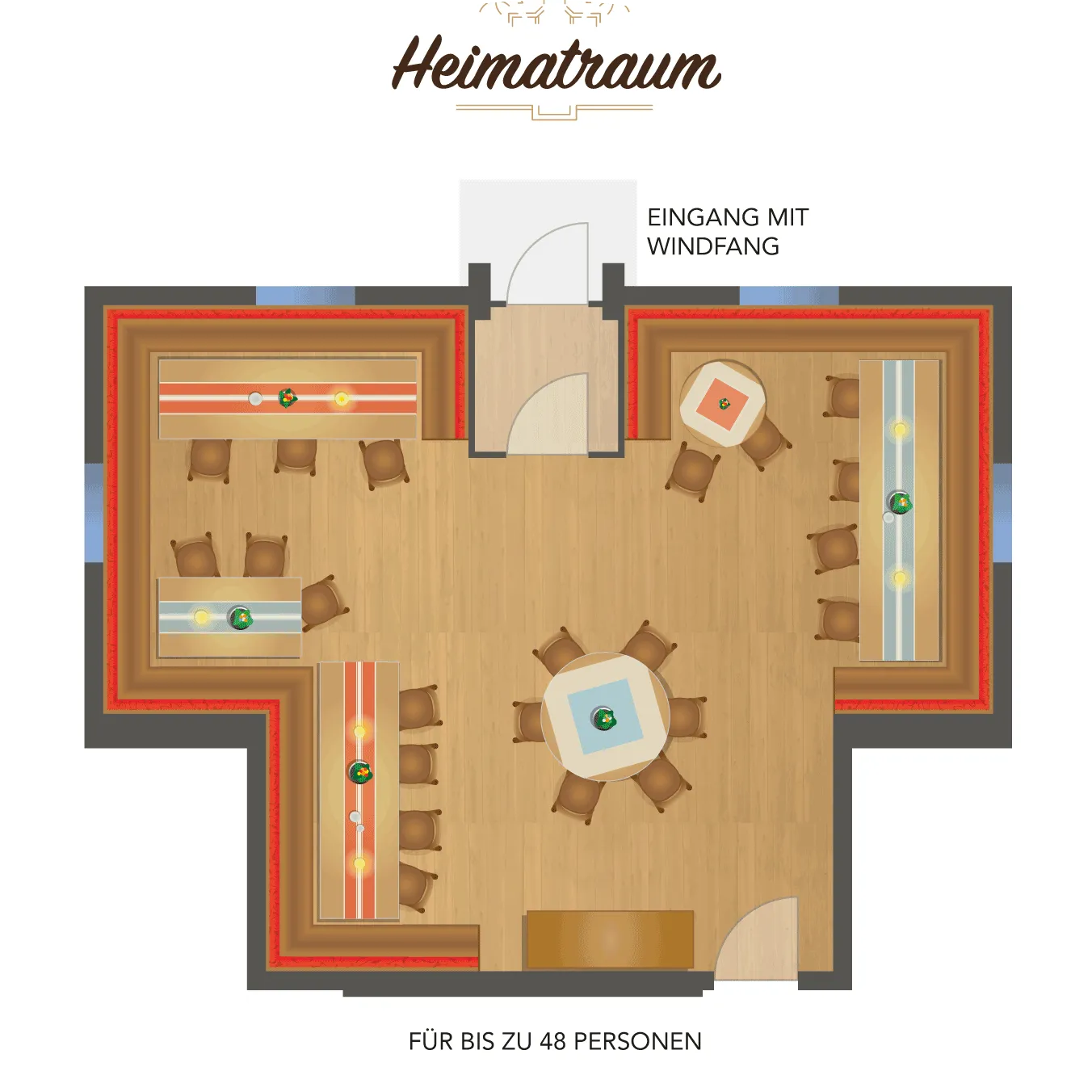 Den besonderen Augenblick in unserem Heimatraum erleben- perfekt für kleinere Gesellschaften von bis zu 50 Personen. Dieser urige Raum kann nicht nur für Brautschminken, Fotozimmer, Umkleideraum oder Kinderbetreuung genutzt werden, sondern auch zusätzlich zu unserem eleganten Saal gebucht werden.